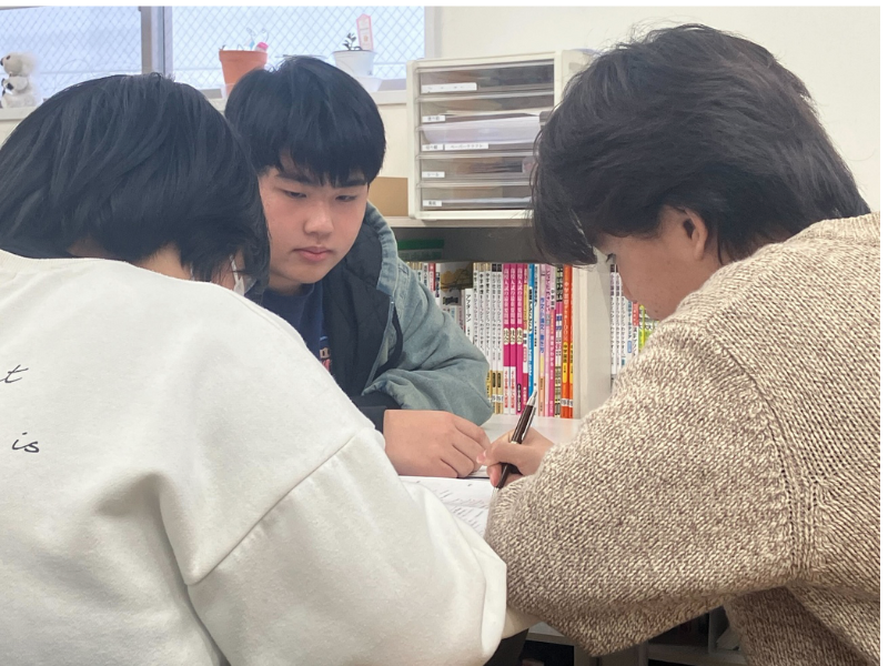 この日、教室に残っていたのは、高校受験を控えた中学3年生。誰かに言われたわけでもなく、生徒たち自身の「学びたい」「支え合いたい」という気持ちから生まれた、自発的な学びの場です。教える側は、相手の理解度に合わせて丁寧に説明し、教わる側は真剣な表情でうなずきながらノートを取るなど、互いを尊重し合う姿が印象的でした。