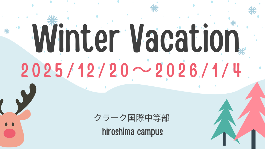 クラーク国際中等部・広島キャンパスの冬季休業について、お知らせいたします!広島キャンパスの冬季休業期間は、2025年12月20日(土)~2026年1月4日(日)となっております。年内の授業見学や個別相談等、ご希望の方は、お早目に下記からお問い合わせく... -