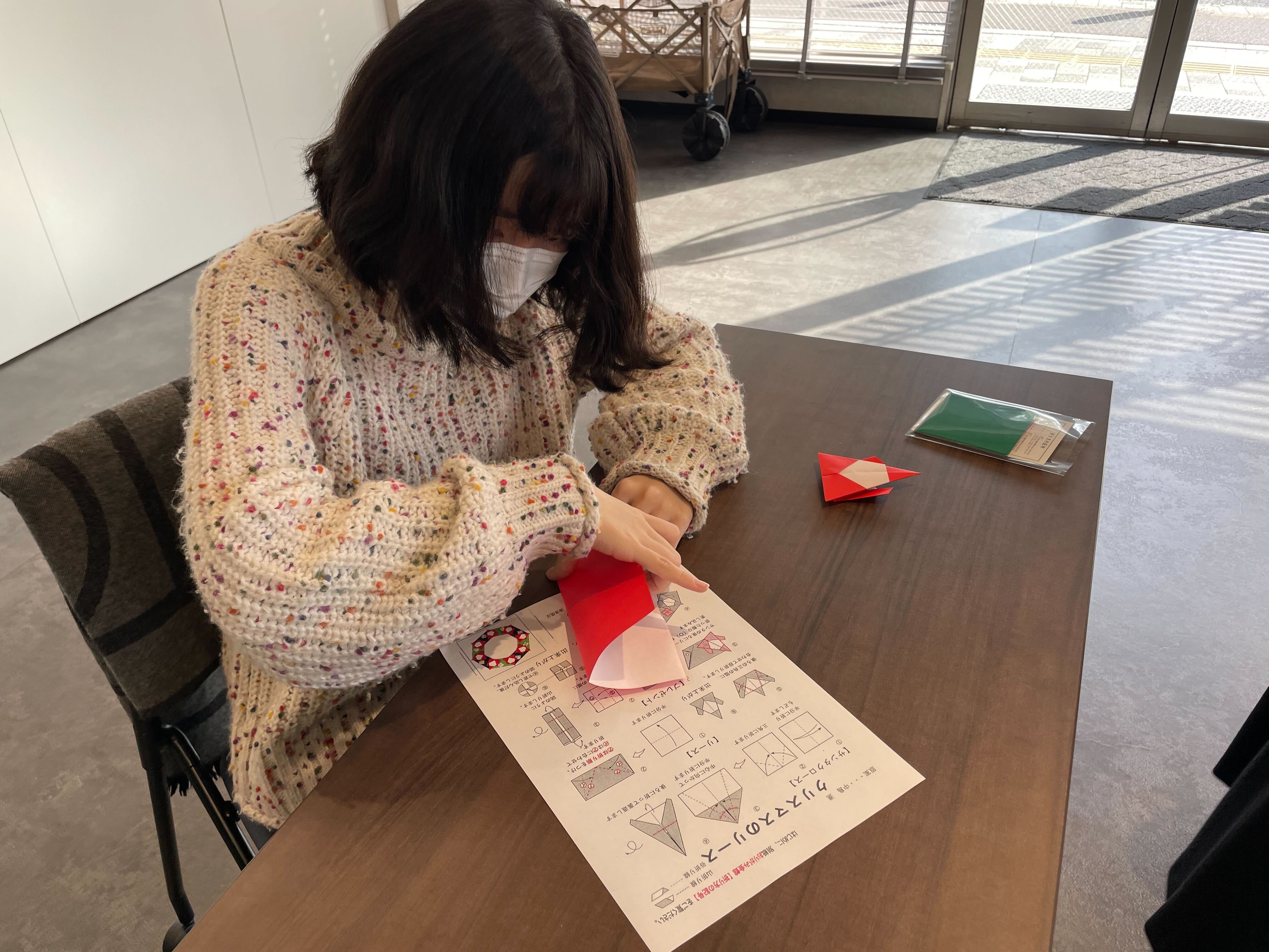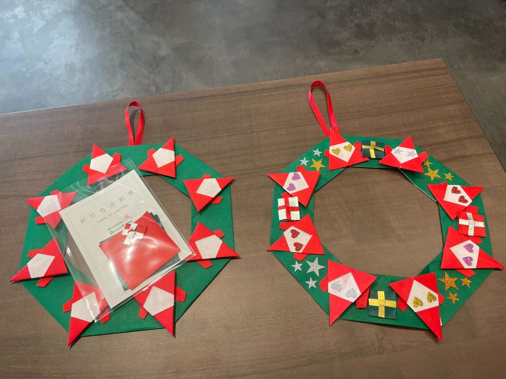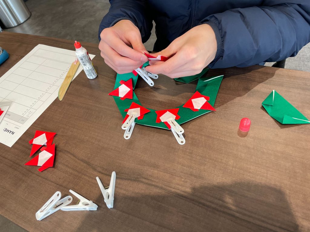 全部折紙を使って、クリスマスリースを作成していきます。飾りには、サンタさんやプレゼントなどを手作りして、リースに貼って完成させていきました◎