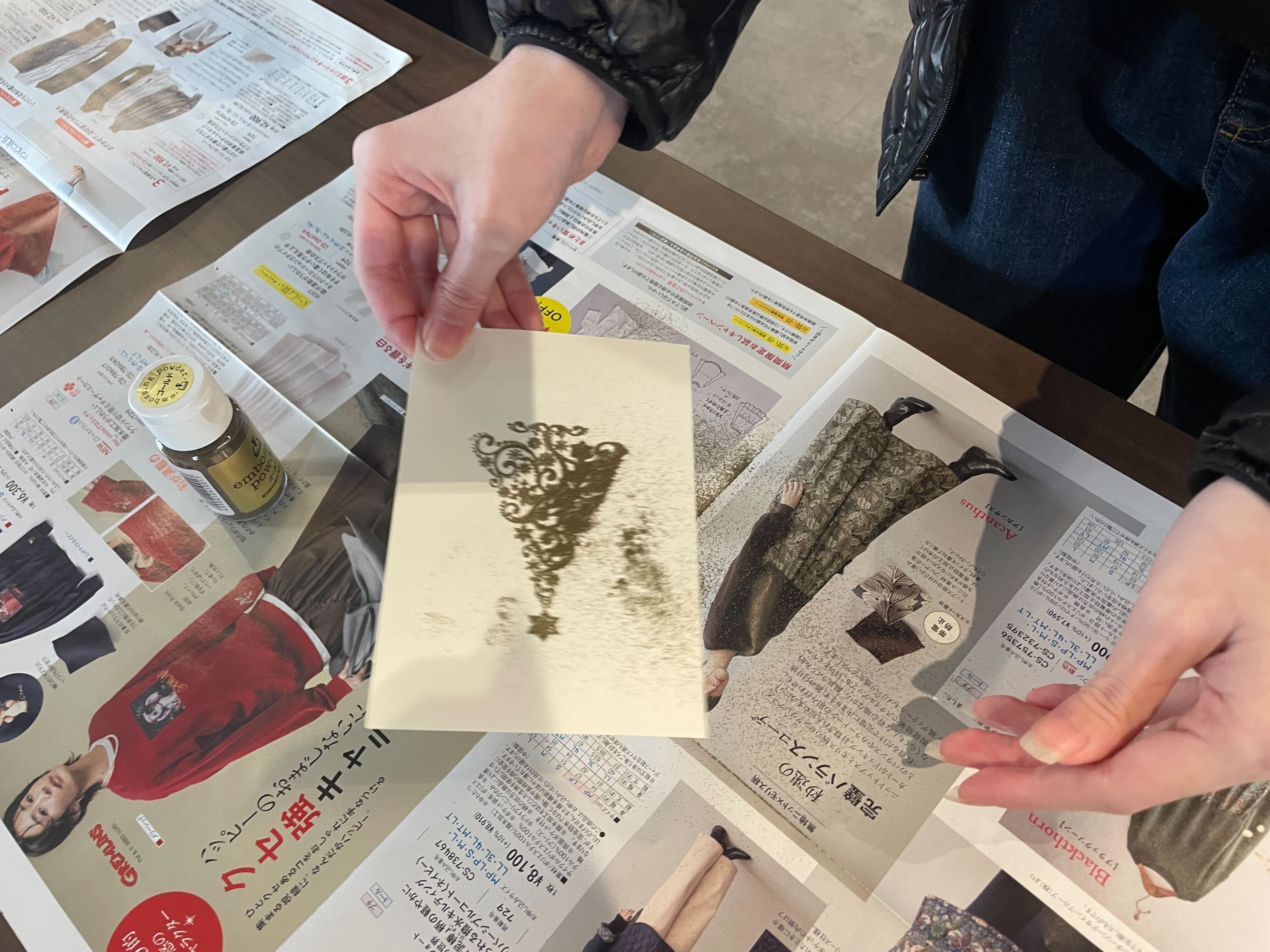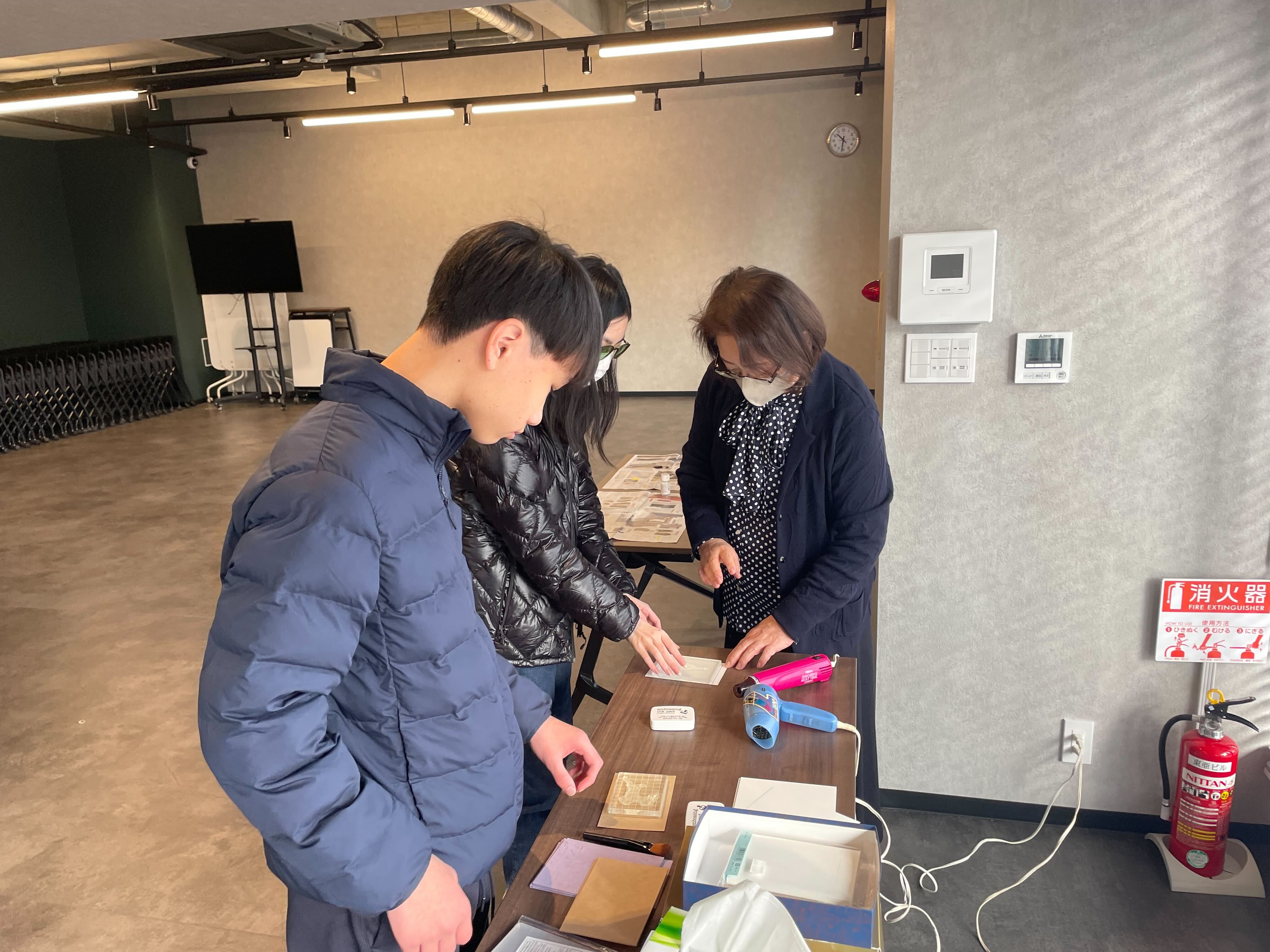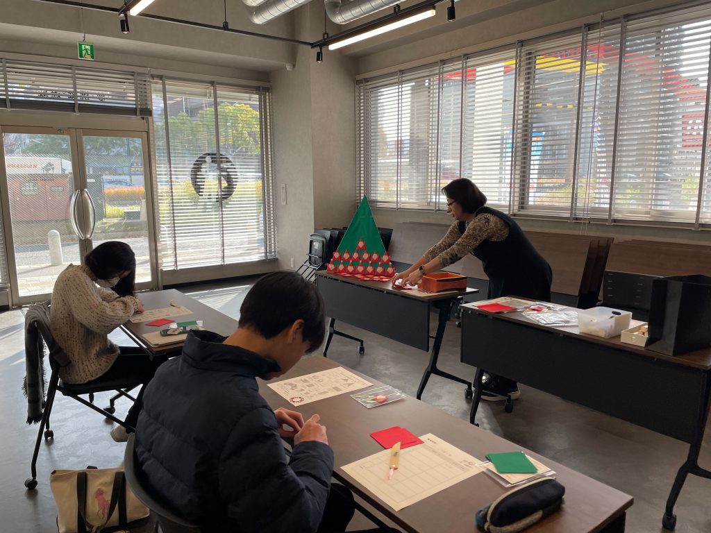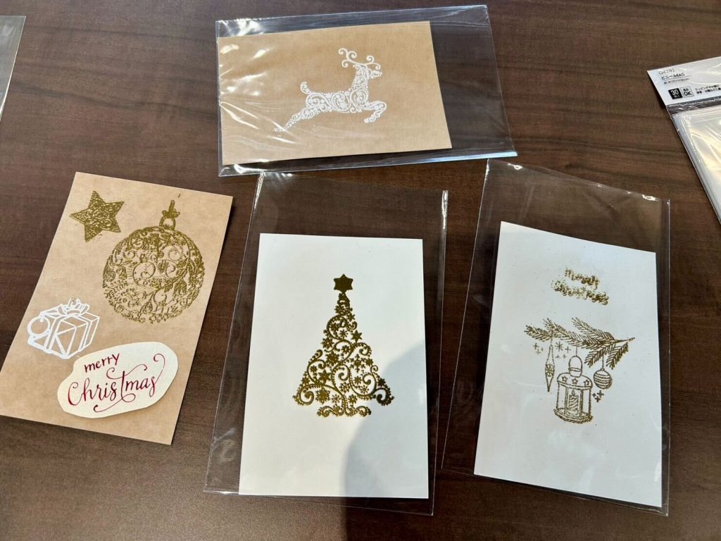 初めてのエンボス加工に挑戦。ツリーやトナカイ等をモチーフに、オリジナルはがきづくりをしました!だんだんの浮かび上がる絵に驚きながらも、素敵な作品が完成していました◎