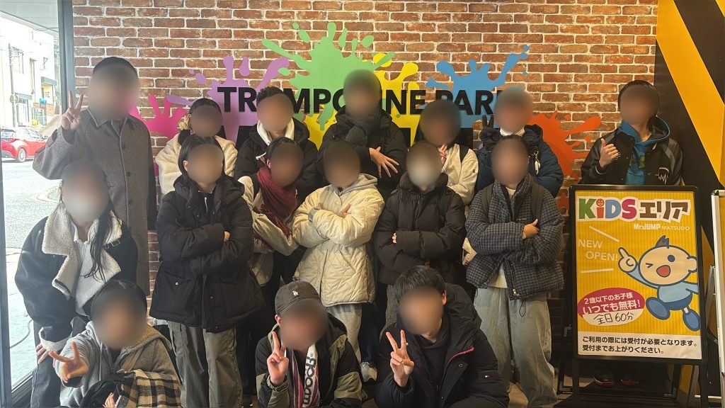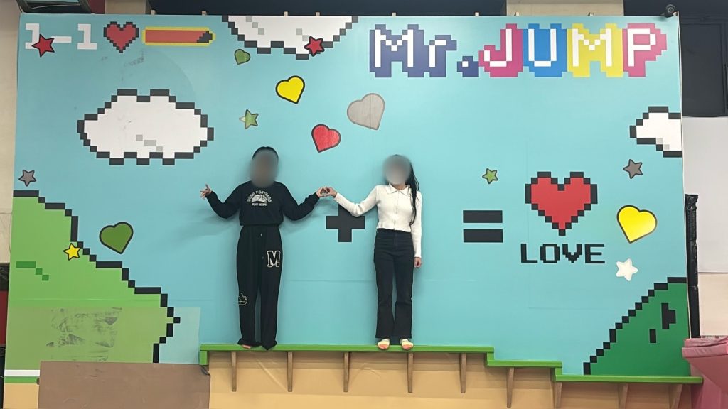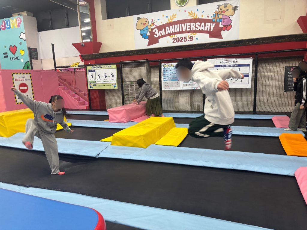 複数のトランポリンで飛び跳ねてみたり、壁面に書かれている技にも挑戦しました。