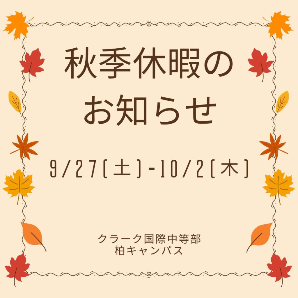 秋季休暇のお知らせ🍁 2025 9/26 お知らせ 2025年9月26日 柏キャンパスは下記の期間、秋季休暇となります。 ●資料請求や各種イベントはHPからお申込みいただけます。 ●お問合せにつきましては10/3以降順次返信させていただきます。 どうぞよろしくお願いいたします。 \ 柏キャンパスの最新情報 / 柏キャンパスへ戻る お知らせ よかったらシェアしてね! URLをコピーしました! 関連記事 【活動紹介】長野宿泊行事~全国の仲間と出会い、共に学び合った特別な3日間~ 2025年10月9日 【イベント案内】『第5回 全国中学生e-Sports選手権』クラーク国際主催 FORTNITE中学生最強は誰だ!?エントリー受付中 2025年10月8日 【セミナー案内】子育てのヒントが見つかるかも?保護者向けセミナーのお知らせ 2025年10月9日 【セミナー案内 】10月25日(土)不登校に悩む保護者のための教育講演会~不安が希望に変わる“次の一歩”を考える~ 2025年9月25日 【留学】~クラーク国際中等部の留学~ 2025年10月3日 【探究の時間】高校生の特別授業!発想力を鍛えるには? 2025年9月24日 【オンライン授業体験紹介】夢中教室の伴走先生に聞く!自分らしい人生の探し方vol.6 『ピンチこそチャンス! 為せば成る精神で切り拓く未来』 2025年10月3日 【理科の授業】SDGsポスター制作 2025年9月18日
