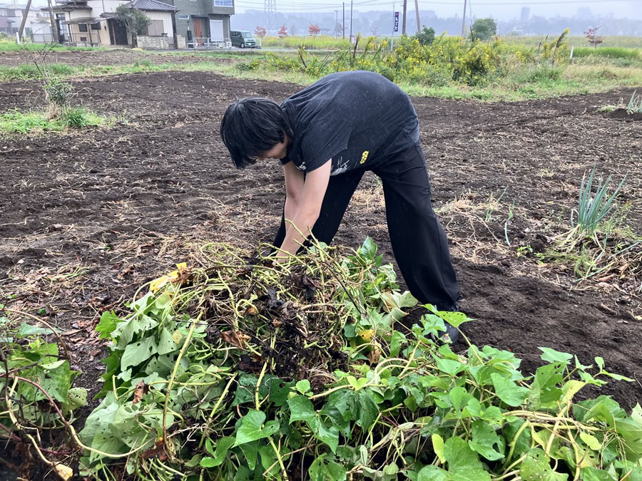 今回掘るさつまいもは、「紅あずま」と「栗かぐや」という品種です。芋を掘る前に蔓を取り、黒マルチというビニールをはがします。これがなかなかの重労働でしたが、みんなで協力して頑張りました!