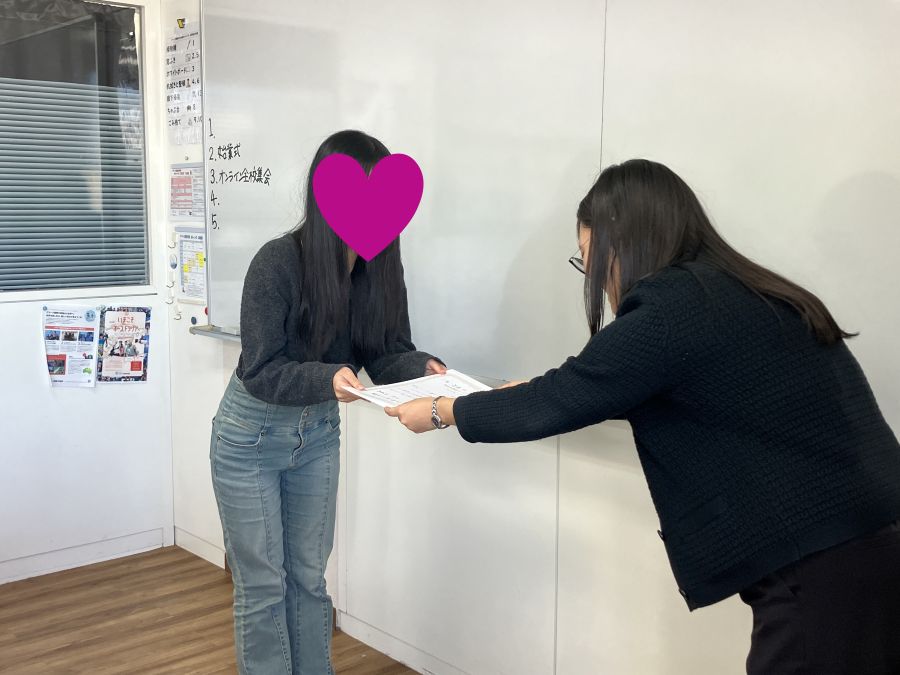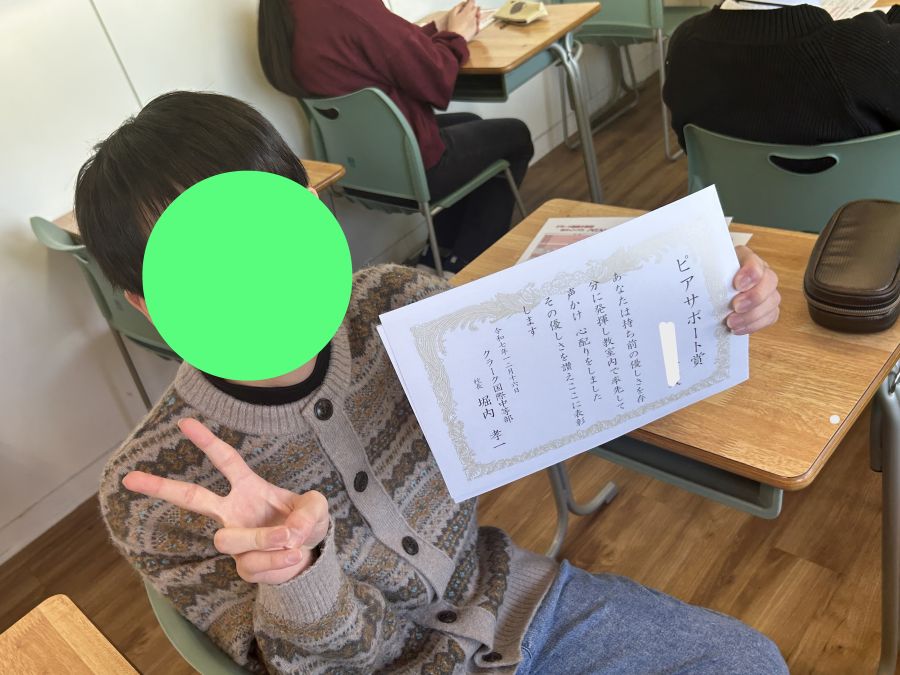 表彰も行いました。毎日通っていた生徒は「毎日来たで賞」、周りの友人を気にかけ、コミュニケーションをとっていた生徒には「ピアサポート賞」、学校説明会などに協力していた生徒は「広報委員賞」、生徒たちが努力していたことを表彰しました。