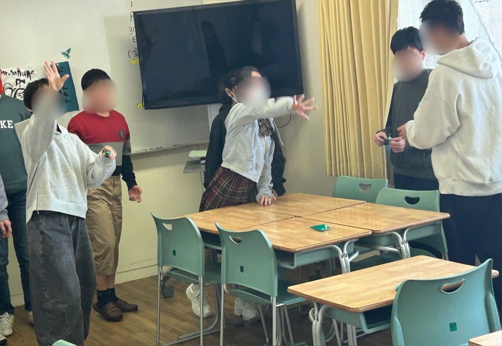後半戦は作った紙飛行機が的の中に入るかを競い合いました。