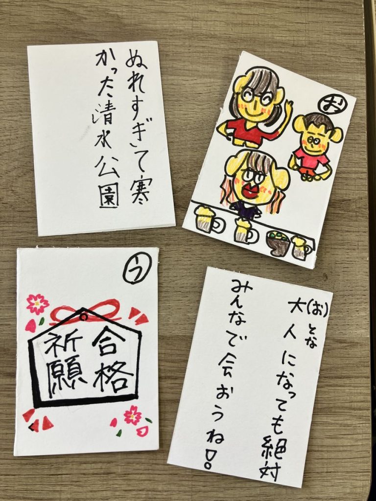 「中等部かるた」で遊ぼう! 2026 2/14 お知らせ 2026年2月9日 こんにちは! 年明けから、国語の授業では中等部にちなんだ「かるた」作りをしていました。 生徒たちは今年度に中等部で起こった出来事や、印象的だったことや物、思い出の課外活動などについて読み札に書く文章を考えたり、読み札に合った絵を描いたりしました。 そして、本日かるたが完成! みんなで遊んでみました♪読み札が読まれると、そのときの思い出がよみがえり楽しい時間となりました(*^-^*) クラーク国際中等部柏キャンパスでは『資料請求』、『説明会』、『授業体験』、『個別相談』を実施しております。詳細はこちらから! \ 柏キャンパスの最新情報 / 柏キャンパスへ戻る お知らせ よかったらシェアしてね! URLをコピーしました! 関連記事 🌸春季休暇のお知らせ🌸 2026年3月24日 修了式を行いました 2026年3月24日 卒業証書授与式 2026年3月24日 ピアの授業~楽しく防災を学ぼう~ 2026年3月14日 【活動紹介】中等部生がCLARK AWARDSに登壇 全国の舞台でプレゼンを披露 2026年3月13日 卒業に向けた準備 2026年3月24日 卒業遠足 2026年3月9日 今年度ラストの書道の時間 2026年3月9日