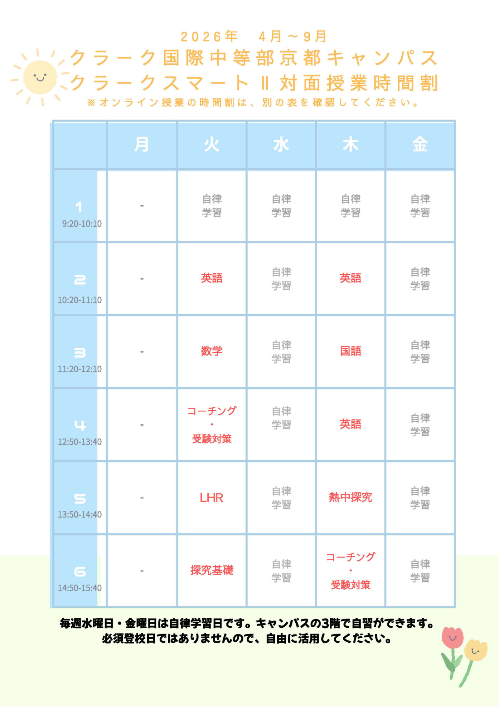 クラーク国際中等部京都キャンパスは、JR・地下鉄二条駅より徒歩7分にあるフリースクールです。便利なアクセス環境にあり、個別指導や自主性を重視したカリキュラム、生徒一人ひとりの目標に合わせた学びをサポート、学習支援やキャリア相談など、安心して通えるフリースクール環境を整え、充実した学習体験を提供します。