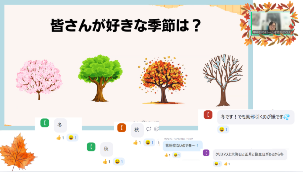 今回はみんなに「好きな季節は?」という質問からスタートしました。生徒みなさんそれぞれ好きな季節と、理由もチャットで打ってくれている人も🍂