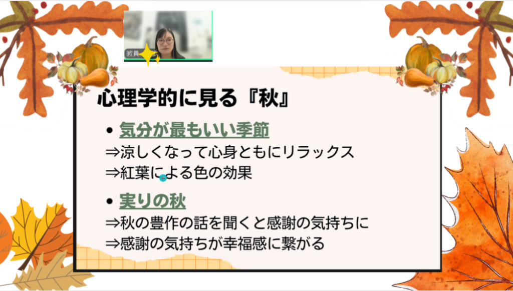 今回のコミュニケーション心理学の授業では「秋と心理学」をテーマに授業が行われました!