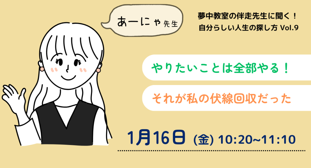 【オンライン授業体験紹介】夢中教室の伴走先生に聞く!自分らしい人生の探し方vol.9『「やりたいことは全部やる!」それが私の伏線回収だった』
