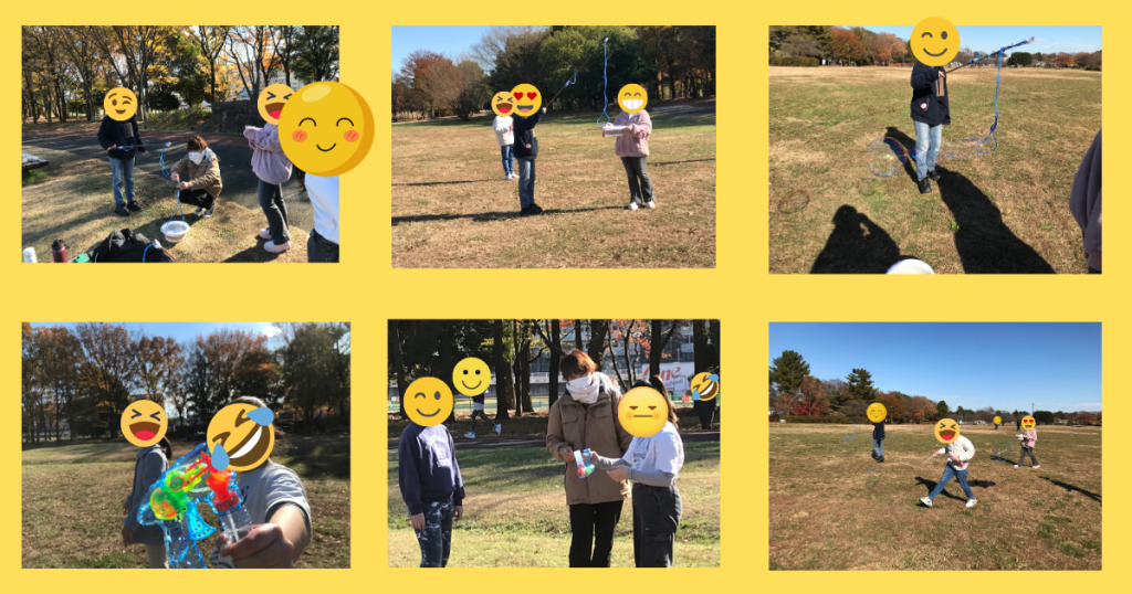 今回は日向ぼっこもかねて?大宮公園でシャボン玉づくりをしてきました。