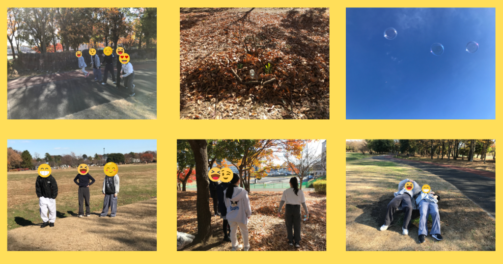 シャボン玉以外でも軽く走ったり、落ち葉で遊んだりと思い思いに過ごせておりました。