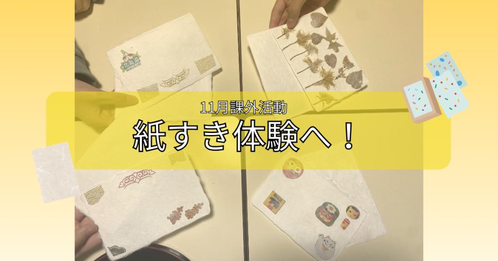 11月の課外活動は江別市にある「蝦夷和紙工房 紙びより」さんへ、紙すき体験へ行きました! 「紙すき」とは?紙の原料を水に溶いて混ぜ合わせ、専用の道具を使ってすくい上げて乾燥させ1枚の紙を作る作業のこと。日本の伝統的な手すき技術はユネスコ無... -