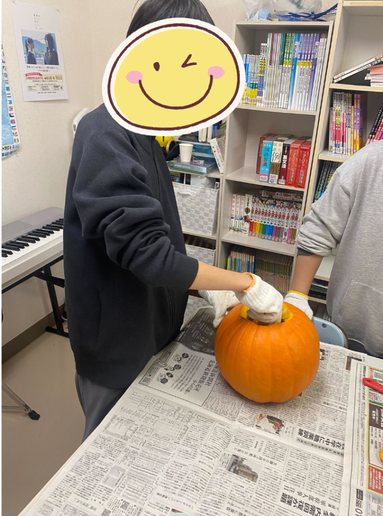 使用するカボチャは生徒の顔よりも大きく、チームに分かれて作業に取り掛かりました。