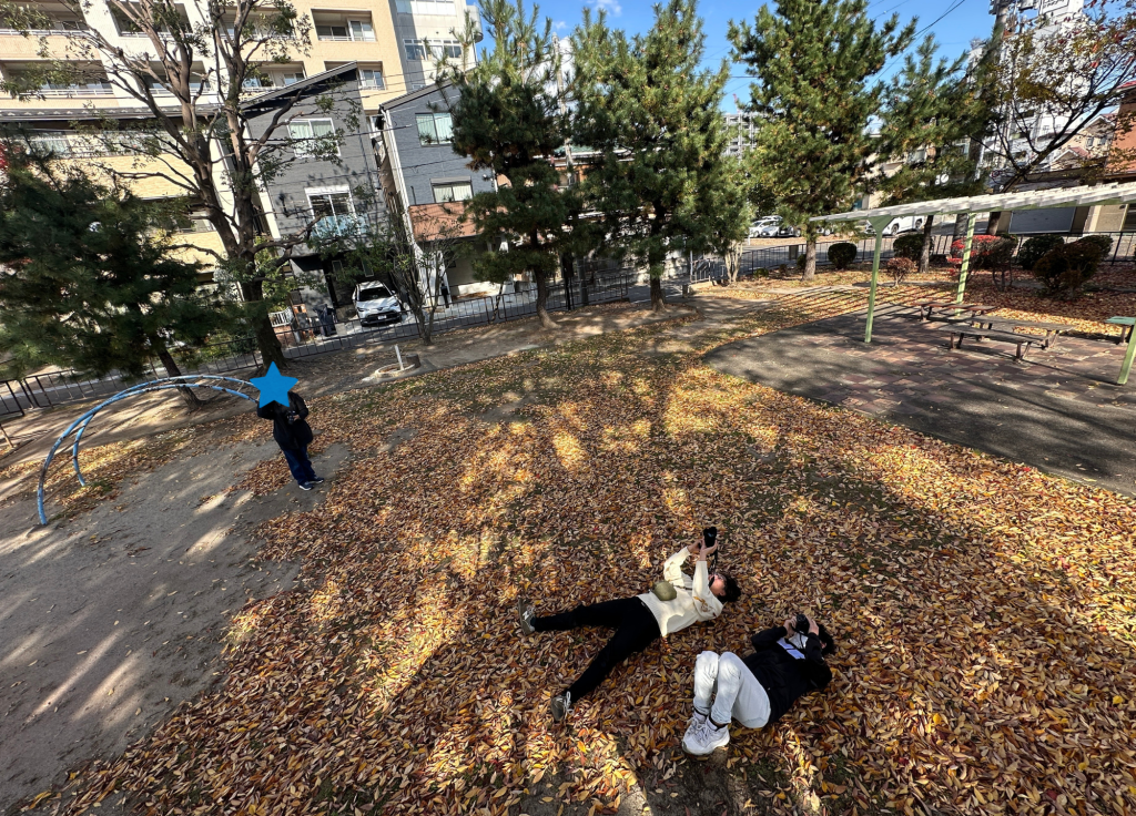 近所の神社や公園を歩きながら、色づいた葉を探して撮影スタート。