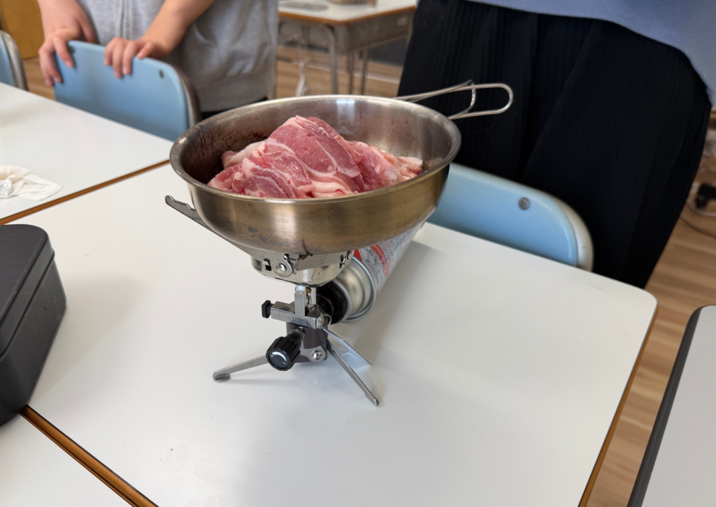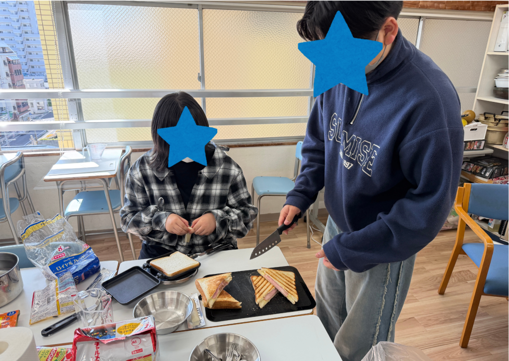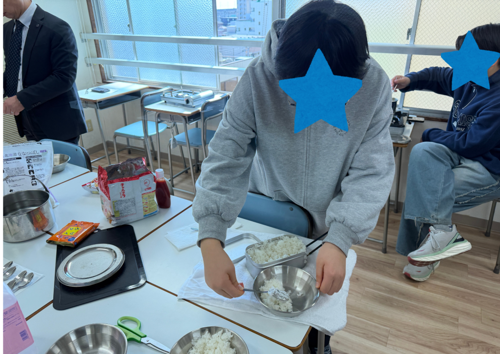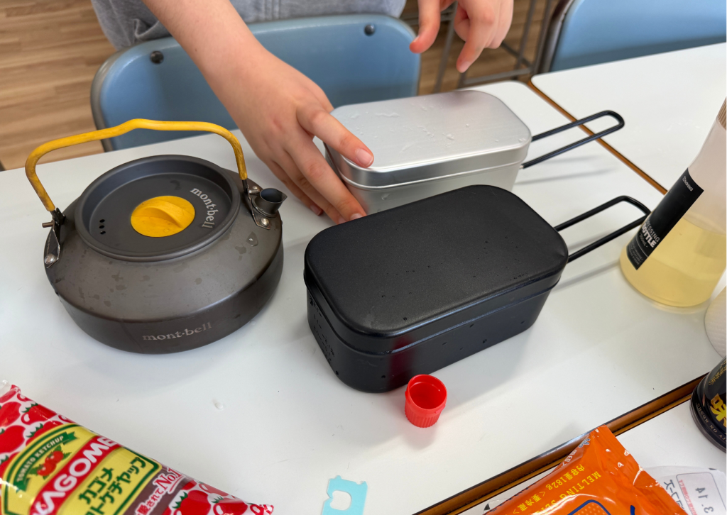 生徒たちはホットサンドをコンロの火を使って調理をしたり、小さい鍋にラーメンを割っていれたりと工夫をして調理をしていました。