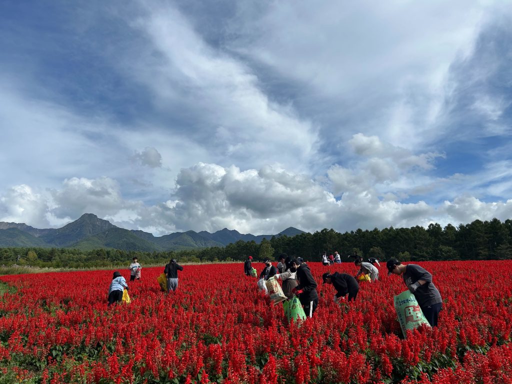 午後は、お花畑をきれいな状態で維持するために、サルビアの花畑の整備を行いました。虫が飛んでいたりして逃げ回る生徒もいましたが、集中して枯れた花を摘んでいました。最後には花畑の真ん中に集まり、ドローンで動画や写真撮影を行いました🌹