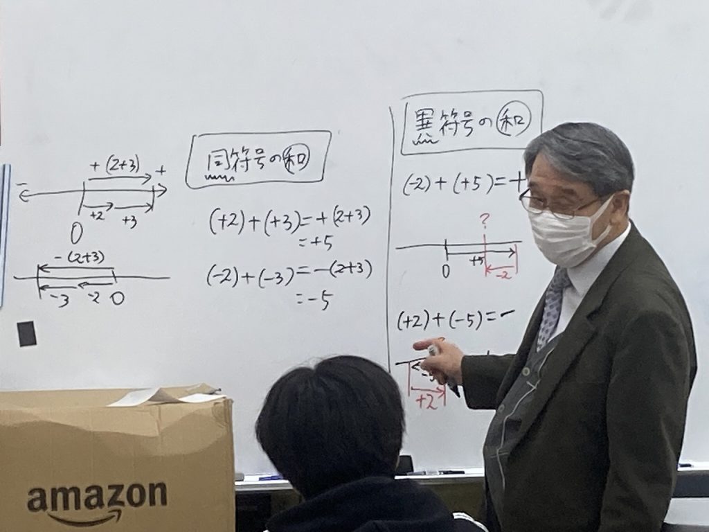 水曜2限は「数学」の授業を行っています。高校に入学する前に,中学生の範囲をしっかりとマスターしましょう!ということを目的として行っています。全体に対して講義をする時間と,一人ひとりに合わせた個別説明をする時間を設け,基礎から応用まで丁寧に学習しています。