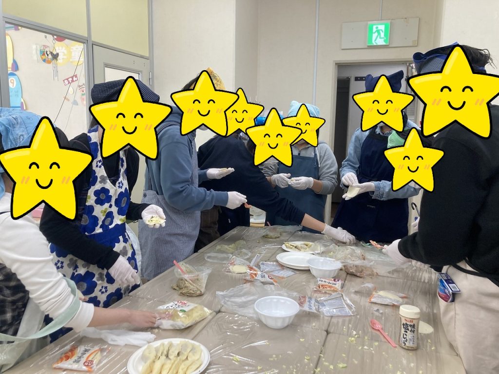 今月は餃子を作りました。食材を刻み,混ぜ,餃子の皮で包み,しっかりと焼き上げるという料理工程をみんなで協力して行いました。また,生徒の発案でチーズ入りの餃子やチーズのみの餃子など楽しみながら作りました。