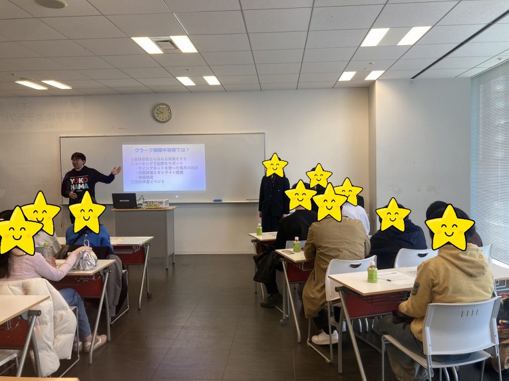 クラーク国際中等部横浜キャンパスではおよそ月に2回のペースで土曜日(まれに日曜日)に学園説明会を行っています。説明会では担当教員からの説明だけではなく,在籍している生徒にも登壇していただき,インタビュー形式で発表を行っています。
