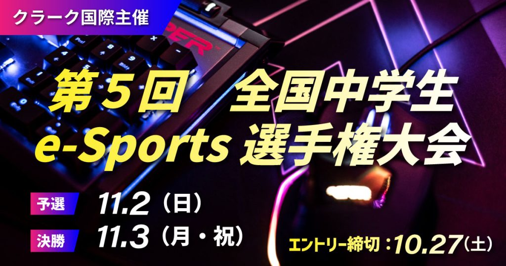 第5回 全国中学生eスポーツ選手権 クラーク記念国際高等学校が主催する全国規模のeスポーツイベント「第5回 全国中学生eスポーツ選手権」が、今年も始まります。毎年多くの中学生が参加し、オンライン・オフラインのステージで熱い戦いを繰り広げています... -
