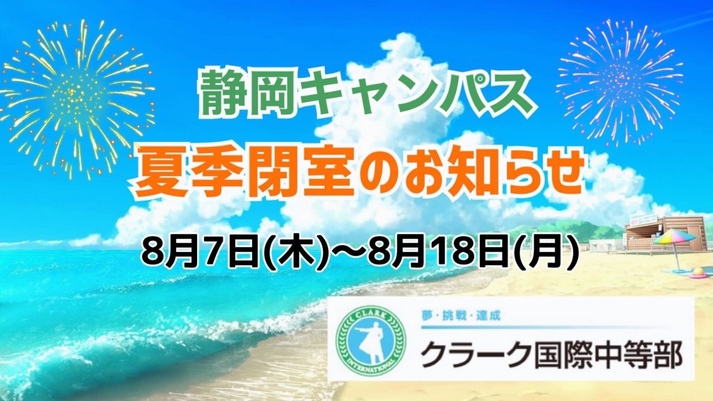 クラーク国際中等部静岡キャンパスは8/7 (木) から 8/18 (月) までの間、夏季休暇のため閉室となります。ご連絡いただく場合は、下記をご参照のうえお問い合わせください。 🌻お電話によるお問い合わせ 8/19(火)以降にお問い合わせください。(9:00-17... -