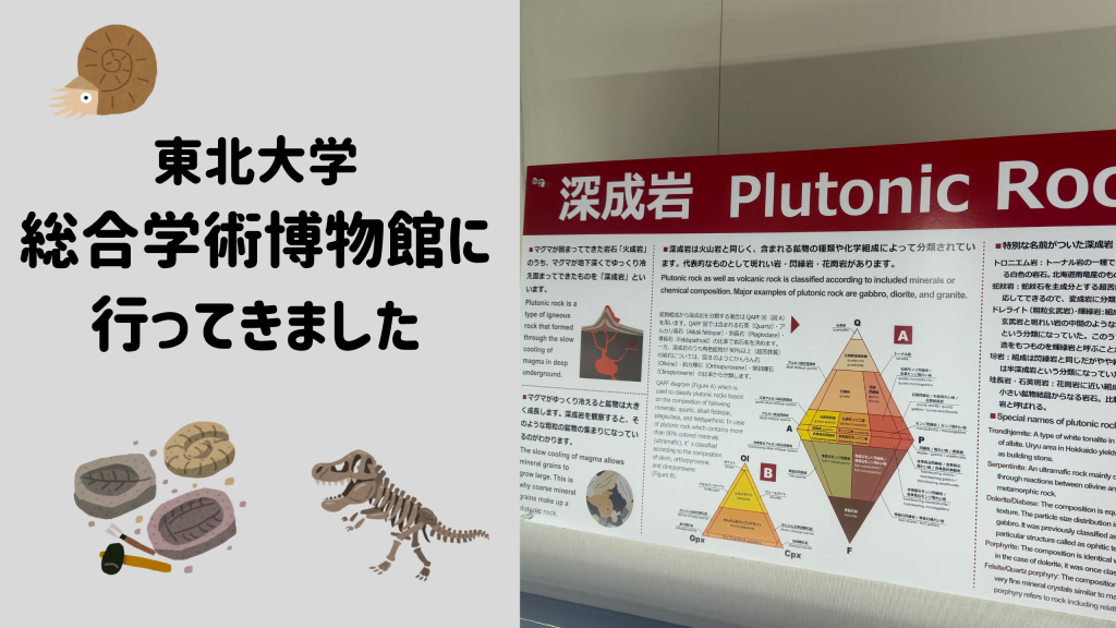 先週の金曜日、校外学習で 東北大学総合学術博物館 を訪れました。館内には、歴史的な資料から宇宙研究の展示まで幅広い内容がそろっており、普段の授業では触れることのできない世界をたくさん知ることができました。 特に印象に残ったのは、古代の化石や... -