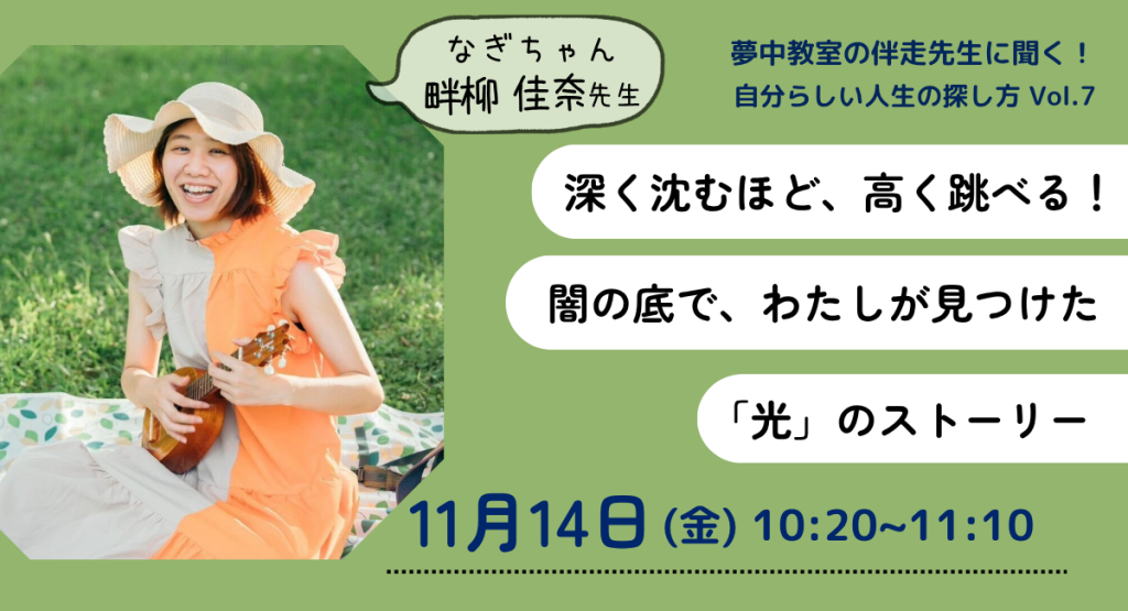 講義内容:夢中教室の伴走先生に聞く!自分らしい人生の探し方vol.7【深く沈むほど、高く跳べる!闇の底で、わたしが見つけた「光」のストーリー】「夢中教室」の伴走先生をゲストスピーカーとしてお招きしての特別授業です。 講師:なぎちゃん先生(畔柳 ... -