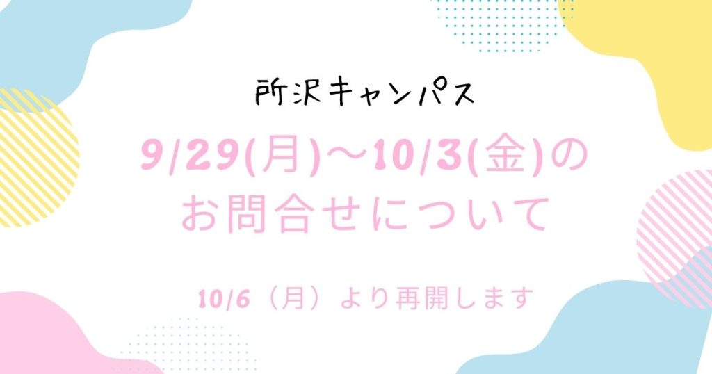 9/29(月)~10/3(金)まで秋休みと宿泊行事のため、HPよりいただいた資料発送は10/6(月)以降に順次発送いたします。個別相談や体験授業のお申込みはHPから受付けておりますが、お問合せへのお返事は10/6(月)以降になりますことご了承ください🙇♀️ ... -