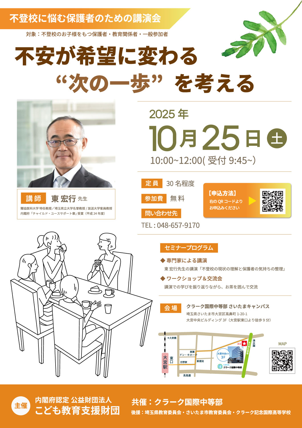 2025年10月25日(土)、こども教育支援財団とクラーク国際中等部の共催で、教育講演会を開催します。
